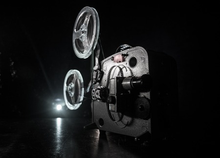 Old vintage movie projector on a dark background with fog and light. Concept of film-making. Selective focus