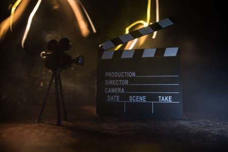 movie concept. Miniature movie set on dark toned background with fog and empty space. Silhouette of vintage camera on tripod and clapboard. selective focus