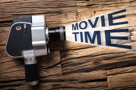 Close-up Of Movie Camera With Film Reel And Clapper Board On Wooden Desk