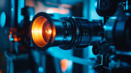 A detailed view of a camera lens illuminated by blue and orange lights inside a photography studio at night. The intricate design and elements highlight its industrial aesthetic.