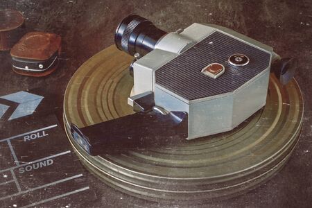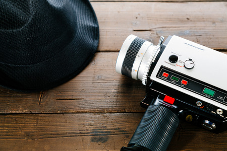 Vintage amateur film movie camera powered by clockwork motor on an old wooden surface