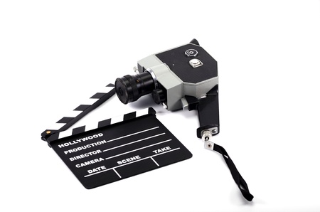 Vintage analog camera for movie making with filmstrip isolated on gray backgrpound.