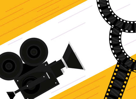 An old vintage video camera with sound with the film negative blurred on yellow background.