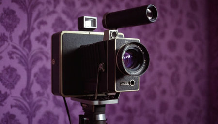 A close-up view presents a video camera, focusing on the lens and body. The scene is illuminated by dramatic blue and red lighting, creating a high-tech or cinematic atmosphere. It's suitable for illustrating media, technology, or production-related themes for diverse commercial uses.