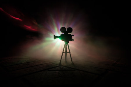 movie concept. Miniature movie set on dark toned background with fog and empty space. Silhouette of vintage camera on tripod. selective focus