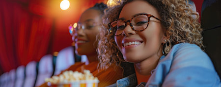 Close-Up of Moviegoers Immersed in a Film, Featuring a black Man in Glasses and other friends , Enthusiastically Holding Popcorn in the cinema