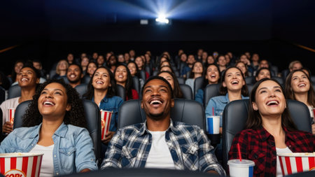 A diverse group of people is seen laughing and enjoying a film in a darkened movie theater. The composition showcases the audience, with varying skin tones and expressions of joy. The lighting suggests a screen presence. This image could be used for promoting cinema, entertainment, or conveying positive emotions.