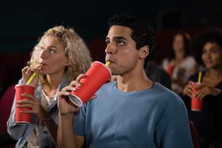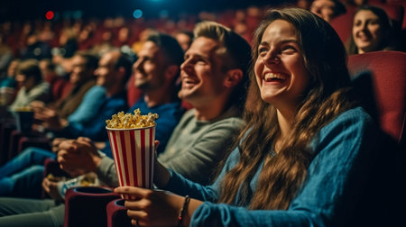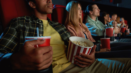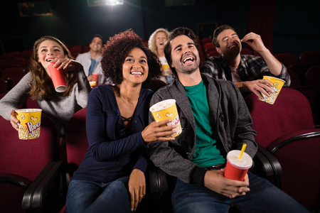 Audience watching comedy movie while eating popcorn snacks and relaxing on a weekend