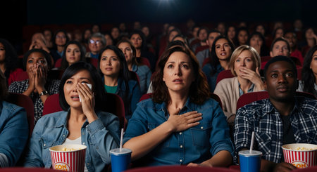 An audience is depicted in a darkened movie theater, engrossed in the experience. The composition features rows of individuals with various expressions. Lighting focuses on the screen and people's faces. This image could be suitable for promotional materials, articles about cinema, or content related to entertainment.