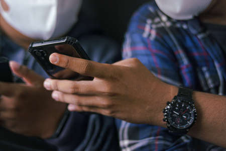 Black and white close up moment of three person in casual colorful clothes sitting and browsing their phones with masks in their hands. Social media and interacting lifestyle during pandemicin 2020