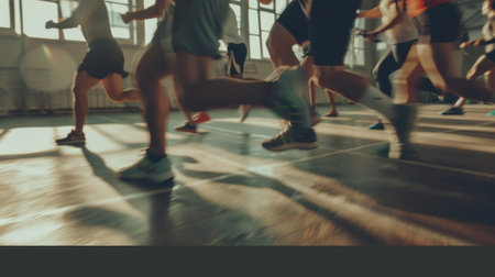 Indistinct figures train together in a fastpaced indoor bootcamp