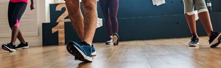 Cropped view of multicultural dancers performing zumba in dance studio, panoramic shot