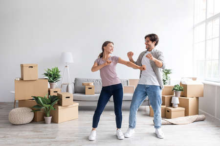 Glad happy european millennial guy and female have fun dancing together in room interior among boxes with belongings. Rent flat, couple enjoys moving day, buy home, mortgage and loan, full length