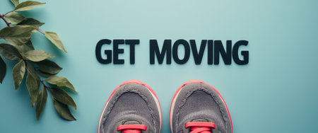 A pair of gray sneakers with vibrant pink accents rests on a soothing turquoise background, accompanied by the inspiring phrase GET MOVING. This image captures the essence of motivation and encourages an active lifestyle, blending fitness with a fresh, modern aesthetic.