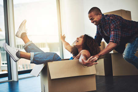 Going for a magic box ride in our new home. Shot of an attractive young couple moving house.