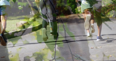 Image of group of caucasian male and female runners in park over leaves. marathon and sport concept digitally generated image.