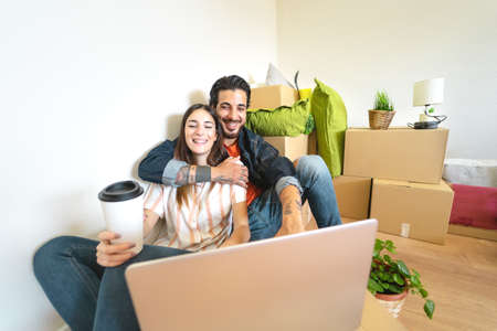 Happy young couple moving in new home first time - Man and woman having fun using computer next carton box in new property house - Change apartment day and people lifestyle relationship concept