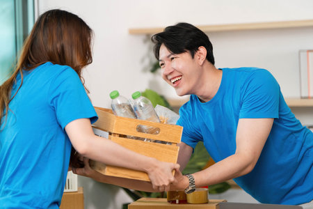 Donation Effort. Young volunteers sharing joy while preparing donation boxes for community support.
