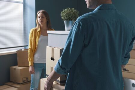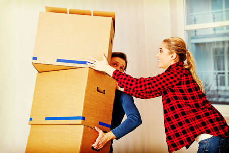 Young couple moving in a new apartment: the man is carrying heavy boxes and his girlfriend is watching