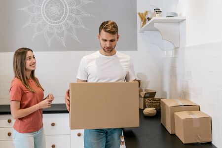 Lovely newlyweds with cardboard boxes moving in new apartment, standing together on kitchen while man looking at package in hands making thoughtful face