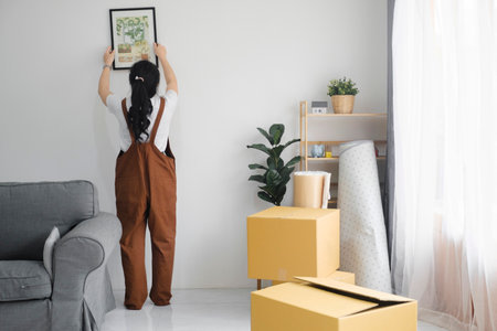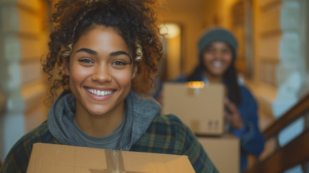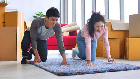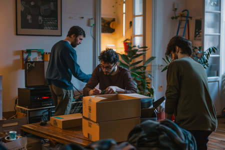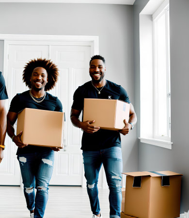 Group of Young Adults moving into new apartments room, carrying boxes and arranging furniture. Moving process enjoyable and efficient with friend.