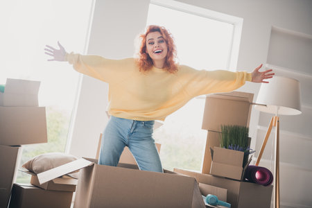 Photo of shiny funky girl dressed yellow jumper relocating new flat indoors house apartment room