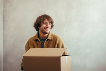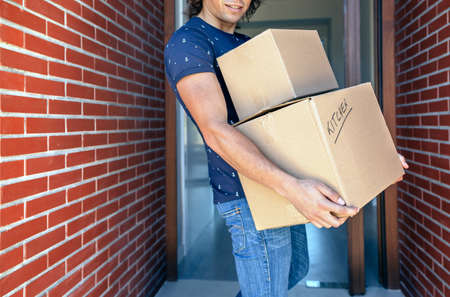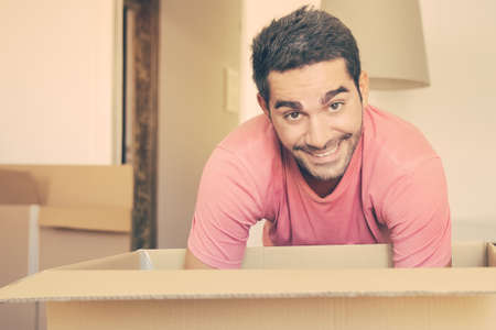 Cheerful young man unpacking things in his new apartment, opening carton box, looking at camera and smiling. Real estate concept