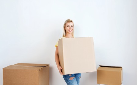 moving, delivery, housing, accommodation and people concept - smiling young woman with cardboard box at home