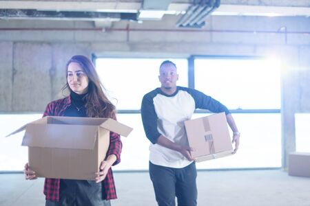 happy young multiethnic casual business team carrying cardboard boxes with sunlight through the windows during moving in at new unfinished startup office building