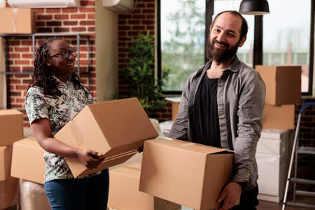 Portrait of diverse life partners posing with boxes on moving day, unpacking furniture and things to decorate rented apartment flat. Using cargo storage to settle in property bought on loan.