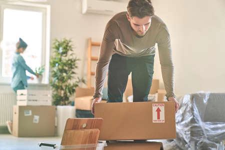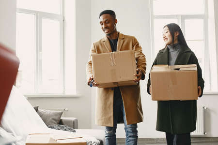 Young couple with big boxes moving into a new house, new apartment for couple, young man and woman helping to lift boxes and organize things for the new home, Moving house.