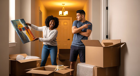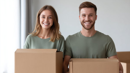 A joyful young couple stands together in a bright indoor space, holding cardboard boxes, expressing excitement about their new adventure and upcoming move.