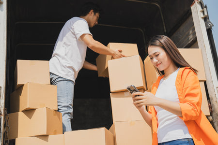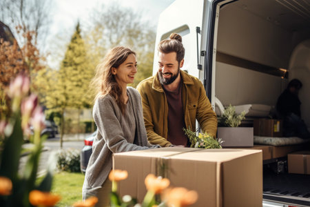 Joyful happy young couple near moving van with boxes. Moving to a new apartment. AI generated
