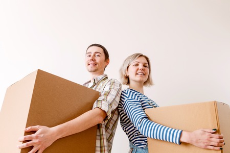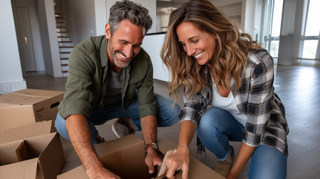 Smiling man and a woman sort cardboard boxes with things after moving into a sunny bright house