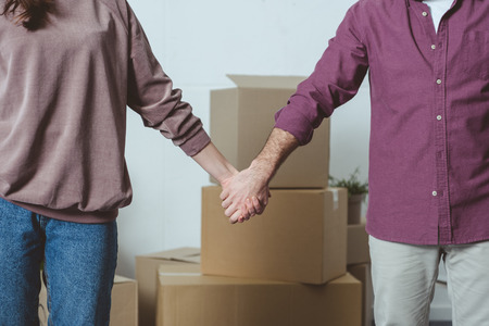 A man and a woman hold hands, against a background of cardboard boxes with things and a white background close-up. The concept of moving to a new home.