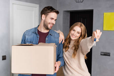Middle aged couple in casual wear, handsome bearded man and pretty blond woman, smiling and hugging at new flat, holding cardboxes. Young family moving to modern apartment.