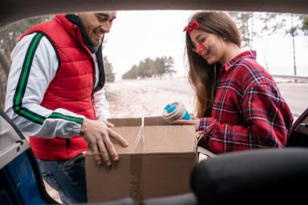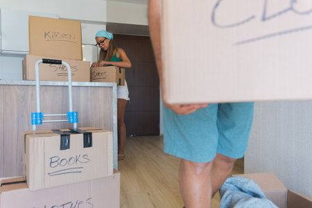 Man and woman moving and unpacking things. Closeup of female and male arms on carton box. Cropped shot. Relocation or new home concept