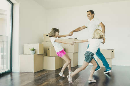 Exited father round dancing with two girls among unpacked boxes. Caucasian dad having fan, smiling and playing with lovely daughters during removal. Family, relocation and moving day concept
