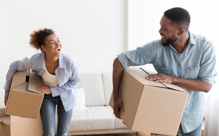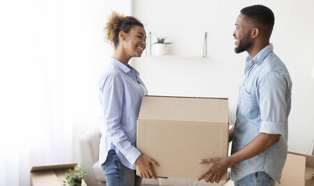 Black Spouses Carrying Moving Box Smiling Each Other Preparing For Relocation Indoor. Free Space