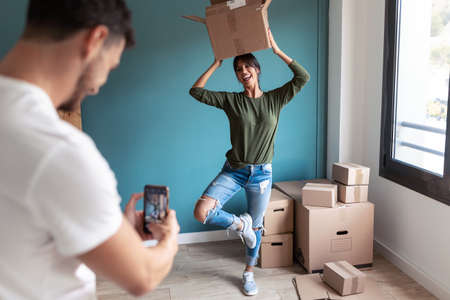 Shot of handsome man taking a photo with smart phone to his funny wife while she jokes with the moving cardboard boxes in the new house.