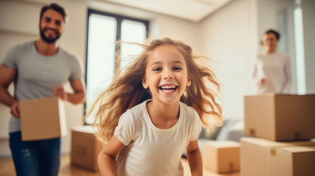 Young married happy couple with little son and daughter stand in hallway of new house. Parents and preschool kids bring hold boxes. Relocation, moving, mortgage, loan, first time buyers concept