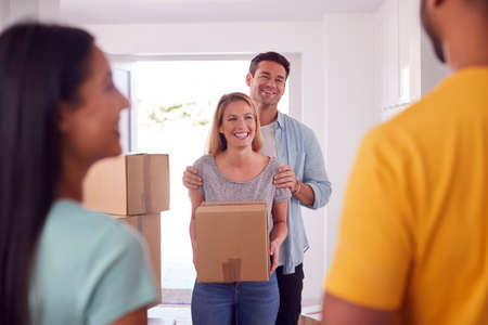 Friends Helping Couple Carry Boxes Through Front Door Of New Home On Moving Day