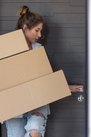 Closeup of young woman with boxes pressing the door handle. Parcel delivery.
