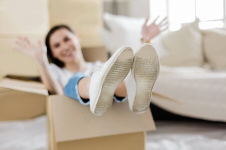 Young woman reaching into moving box, POV angle, one person. Reaching.