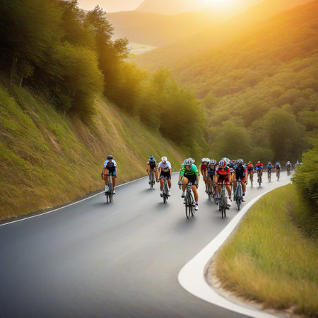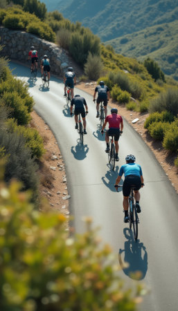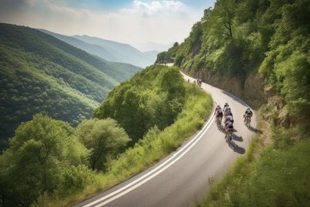 A group of cyclists in colorful outfits pedal down a scenic mountain road surrounded by lush green hills under a clear sky.. AI Generation