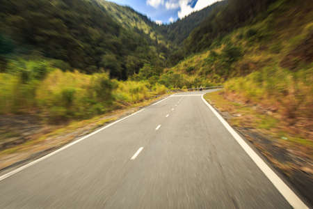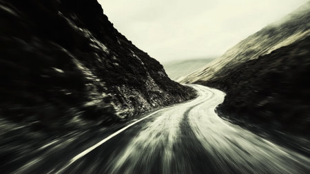 Motion blur effect on a curving mountain road with sharp turns, creating the feeling of speed and thrilling movement