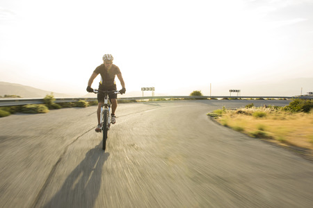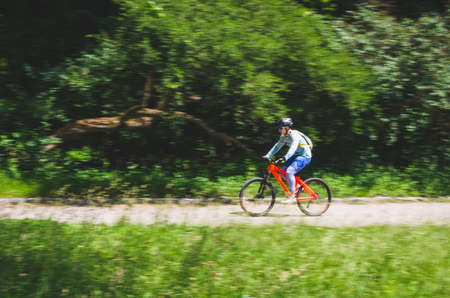 Motion blur, panning image of an isolated bicycle rider wearing helmet for safety on a way for fitness.