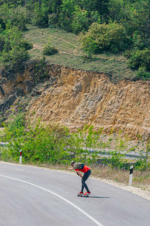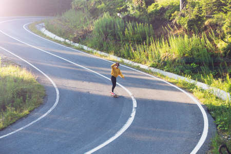 Cinematic downhill longboard session. Young woman skateboarding and making tricks between the curves on a mountain pass. Concept about extreme sports and people