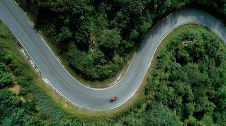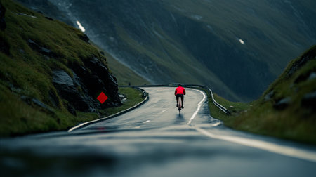 A cyclist rides along a winding road, amidst lush green hills under the soft glow of the setting sun. The scene evokes a sense of freedom, adventure, and the beauty of the natural landscape. Perfect for illustrating travel, outdoor activities, and active lifestyles.