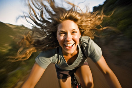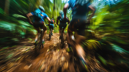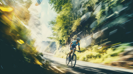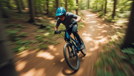 A dynamic shot of a cyclist speeding through a lush forest trail, the motion blur emphasizing the exhilaration and freedom of outdoor sports.